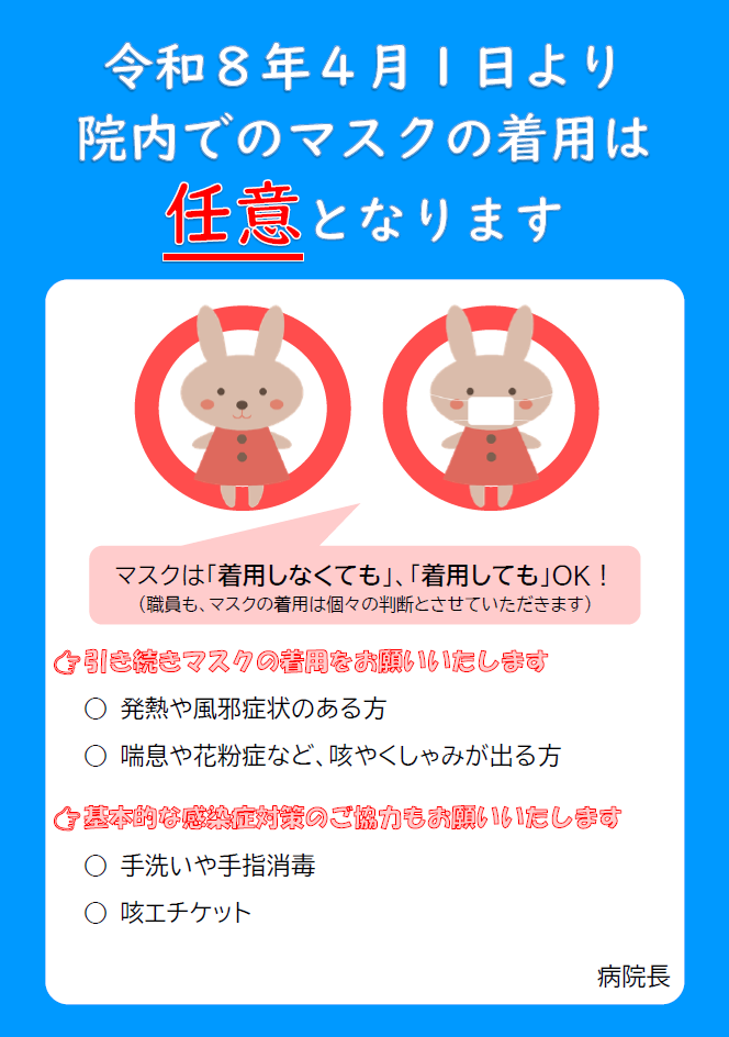 令和8年4月1日から、院内でのマスク着用は任意とさせていただきます。また、職員もマスクの着用は個々の判断とさせていただきますので、ご理解のほど何卒よろしくお願いいたします。【引き続きマスクの着用をお願いいたします】○発熱や風邪症状のある方○喘息や花粉症など、咳やくしゃみが出る方