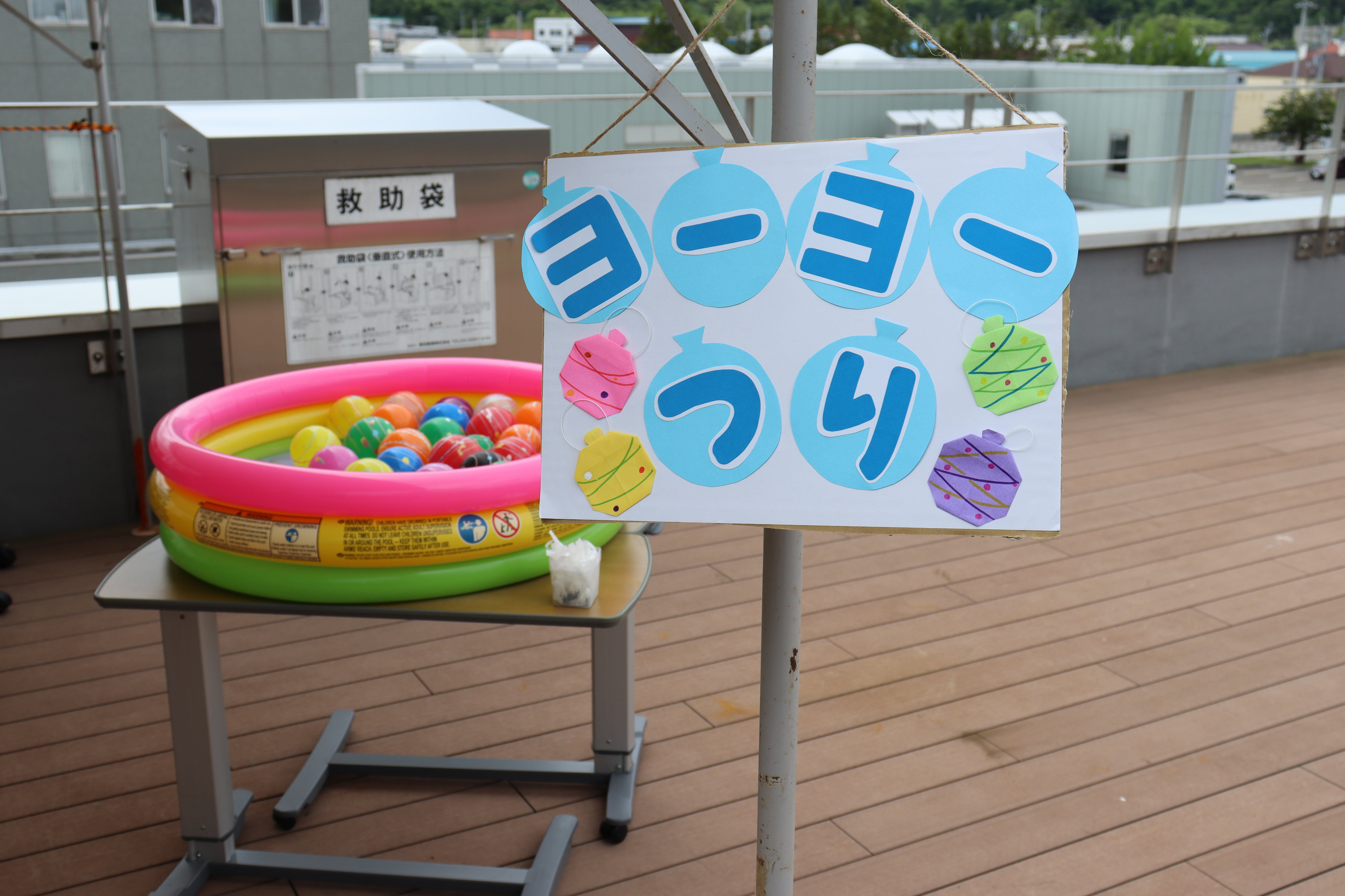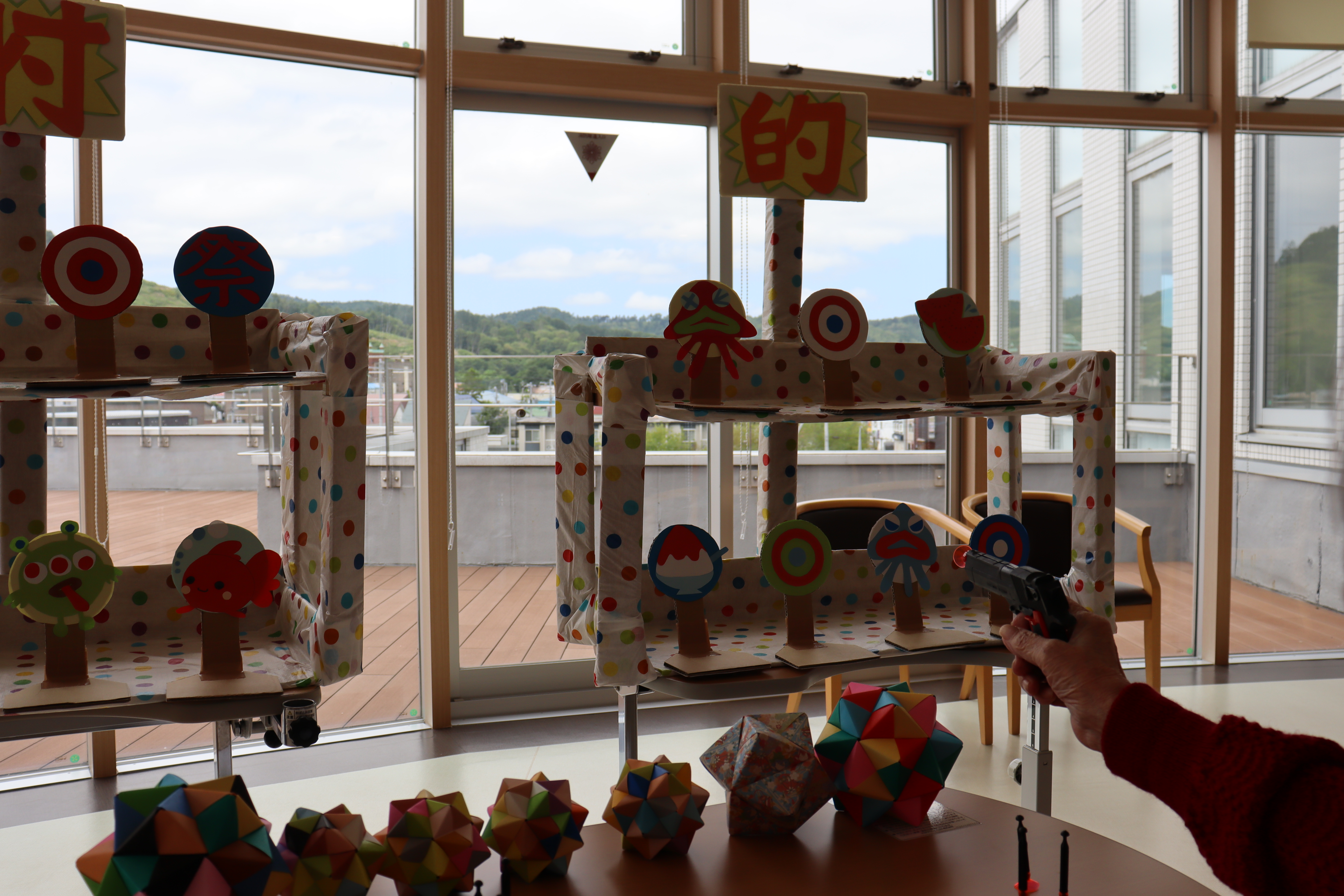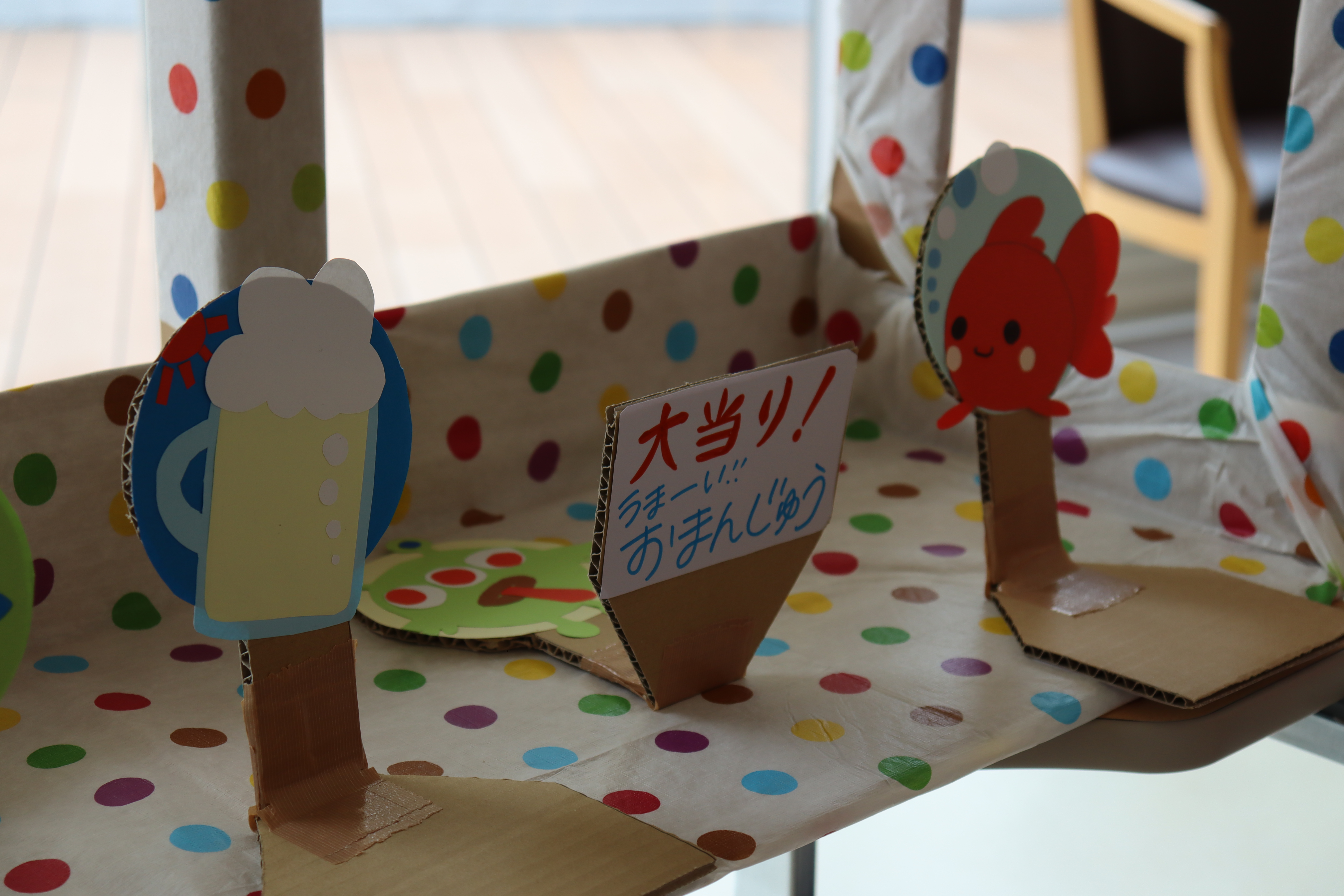 美味しいものを食べた後は、ヨーヨー釣りのほか、今年は病棟スタッフ手作りの射的も用意し、的を当てることができた患者様には、景品をプレゼントいたしました。