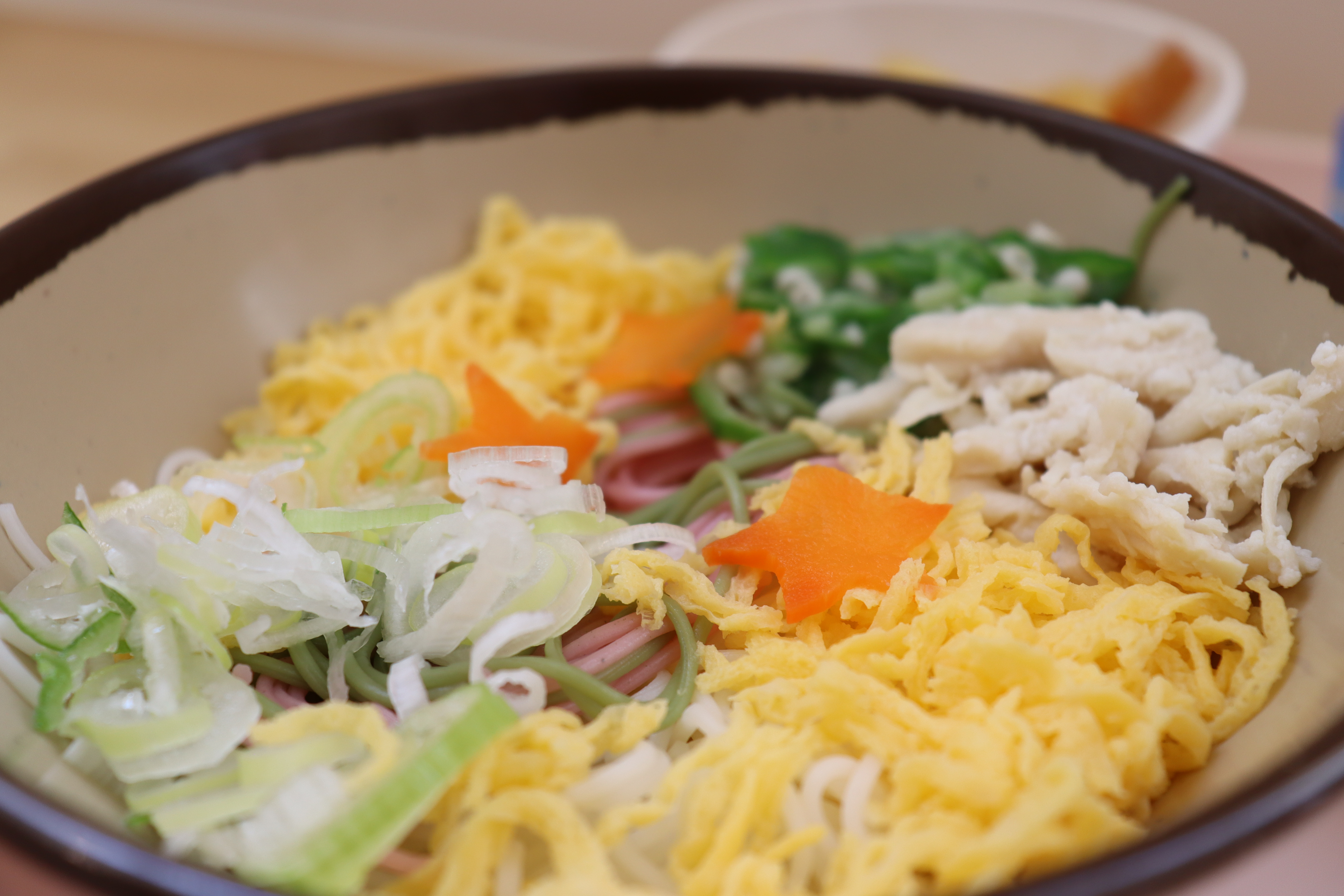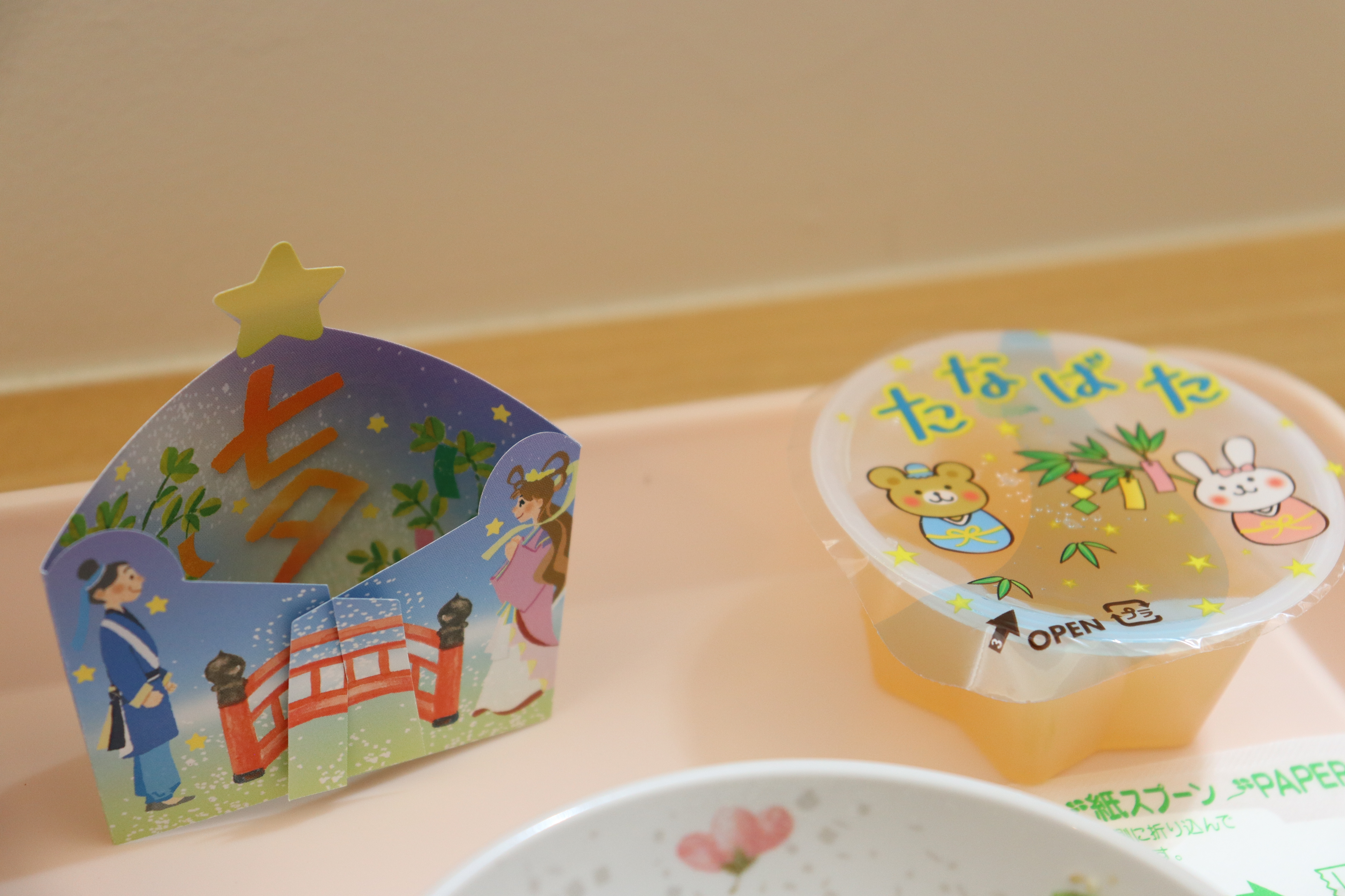 また、この日の昼食は、七夕メニューということで、七夕そうめんや天ぷら、ゼリーなどが用意され、皆さんに喜んでいただいた1日となりました。