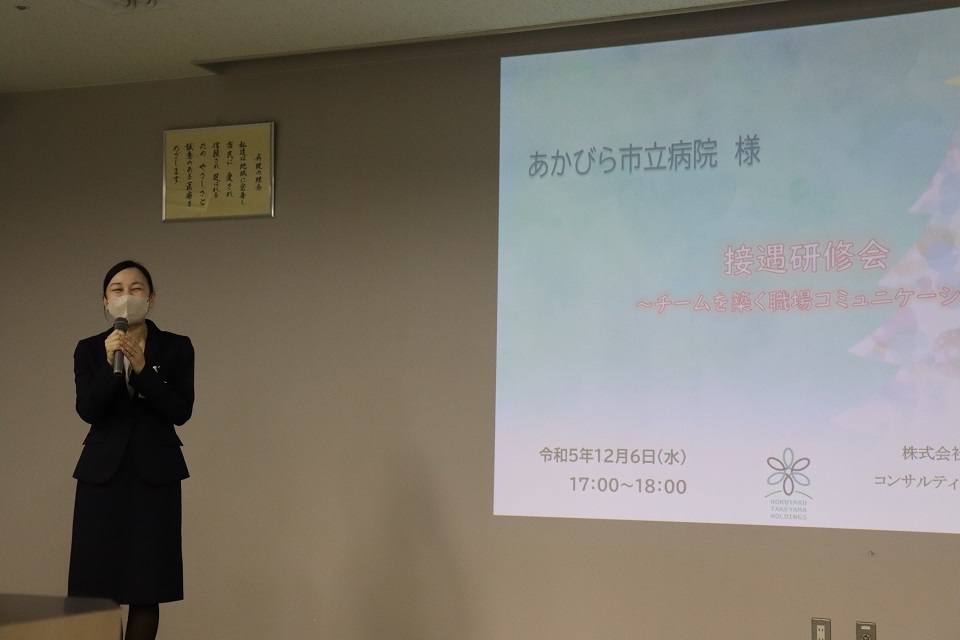 12月6日(水)に、北海道医療情報サービス コンサルティング事業部 接遇グループ 村田 信子様をお招きし、「チームを築く職場コミュニケーション」と題し、4年ぶりに集合形式で接遇研修会を行いました。