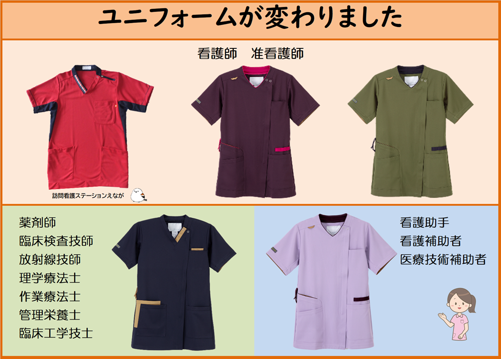 令和7年8月1日から当院スタッフのユニフォームが変更となります。 職種ごとにユニフォームの色が異なりますので、詳細は以下の画像をご覧ください。