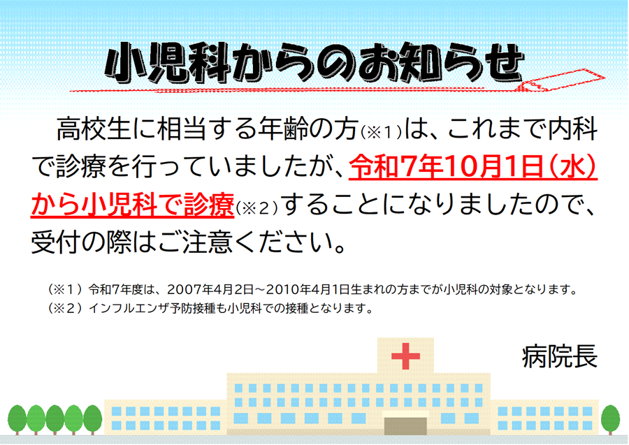 高校生に相当する年齢の方(※1)は、これまで内科で診療を行っていましたが、令和7年10月1日(水)から小児科で診療(※2)することになりましたので、受付の際はご注意ください。